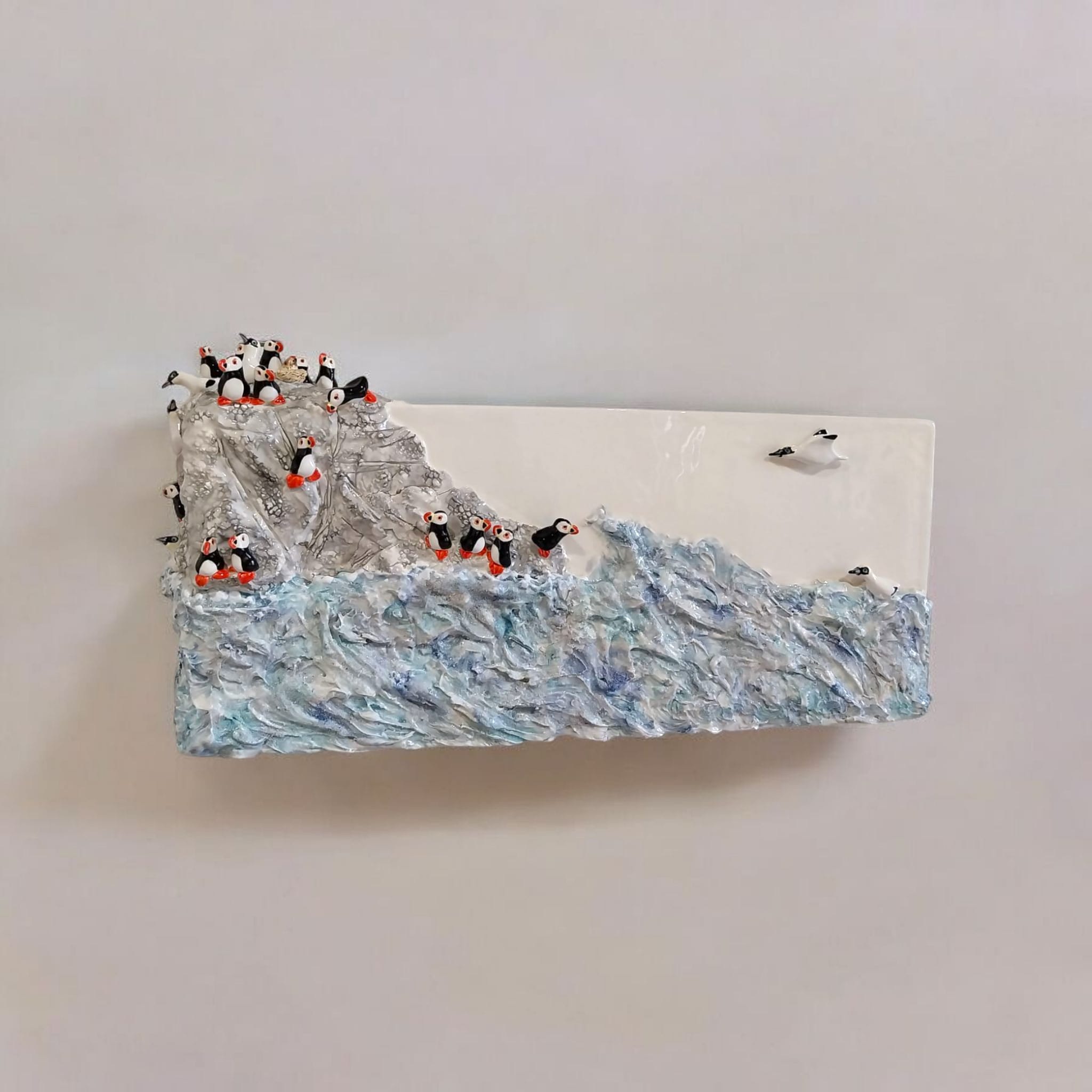 Cette pièce originale, un bas-relief en faïence de 50 x 22 x 12 cm, représente une falaise en bord de mer peuplée de macareux, accueillant l’arrivée discrète de fous de Bassan. Réalisée à la plaque et sculptée en surépaisseur, la pièce a nécessité 20 à 25 heures de travail, incluant façonnage, modelage des oiseaux un par un, première cuisson, émaillage et seconde cuisson.