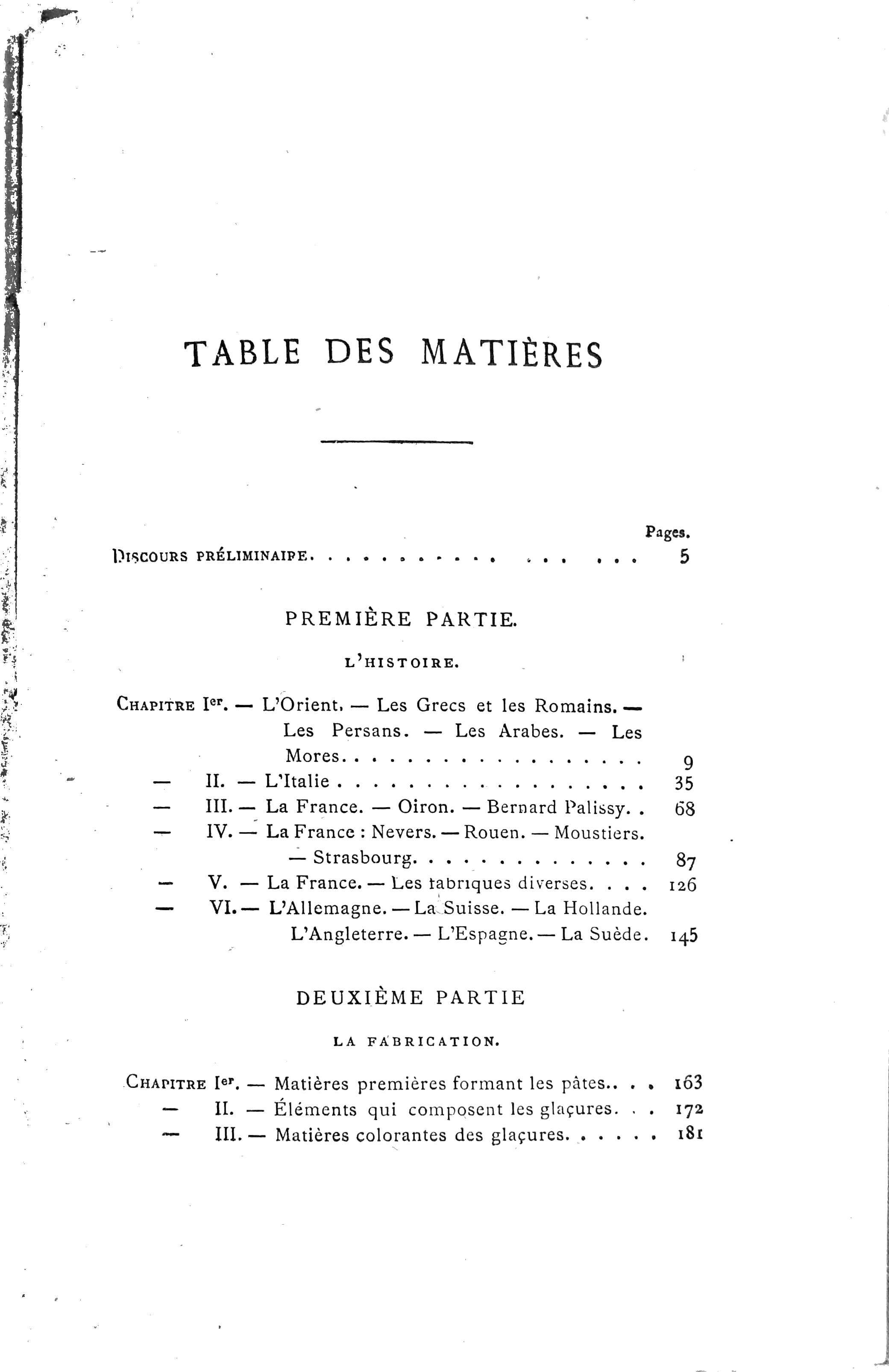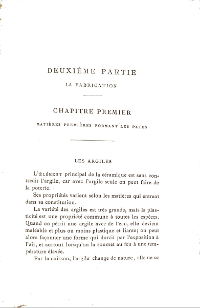 La seconde partie de l’ouvrage constitue un exposé précis des procédés de fabrication : pâtes, glaçures, matières colorantes, techniques de décoration, types de faïences et usages architecturaux. Ces pages, issues de l’expérience directe de l’atelier, conservent aujourd’hui encore une valeur technique et pédagogique remarquable.